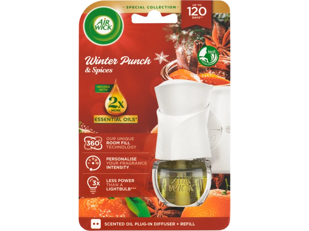 Elektrický osviežovač vzduchu Air Wick Electric Winter Punch Winter Punch & Spices príjemne prevonia váš domov a vytvorí v ňom harmonickú atmosféru.