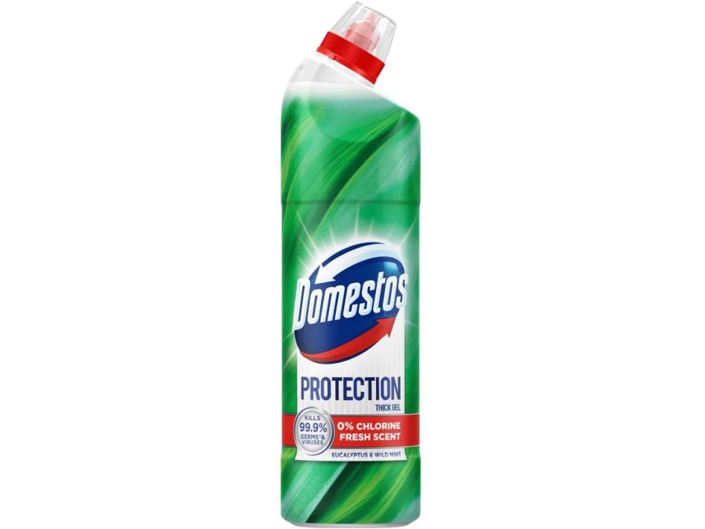 Domestos Protection Eucalyptus & Wild Mint 700 ml je inovatívny dezinfekčný prostriedok, ktorý obsahuje biologicky odbúrateľné vonné látky. Bez obsahu chlóru účinne dezinfikuje toaletu a čistí rôzne povrchy vo vašej domácnosti, pričom za sebou zanecháva sviežu vôňu mäty a eukalyptu. Dezinfekcia DOMESTOS Protection Eucalyptus & Wild Mint zabíja 99,9 % baktérií a vírusov.