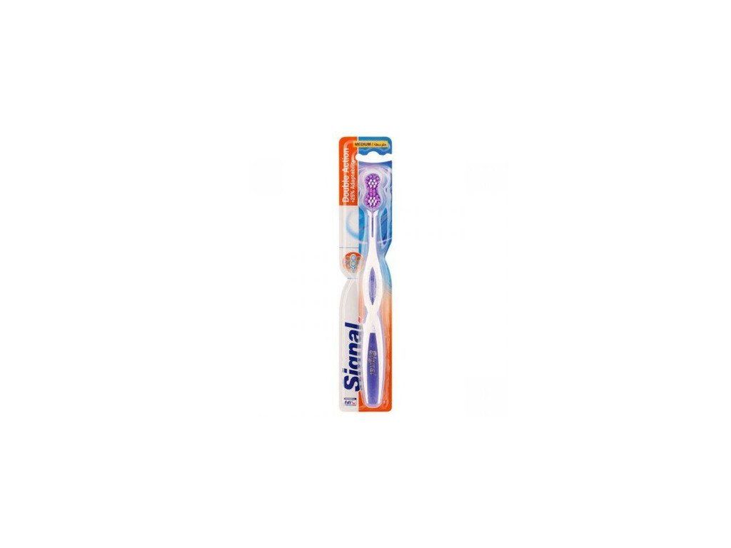Dvojitá hlava zubnej kefky Signal Double Action s dvoma druhmi štetiniek na zuby dosiahne skutočne zo všetkých strán, kefka tak má oveľa väčšiu účinnosť a zároveň jemne masíruje ďasná. Trikrát prehnutá rukoväť kefky uľahčuje čistenie horšie prístupných zadných zubov.